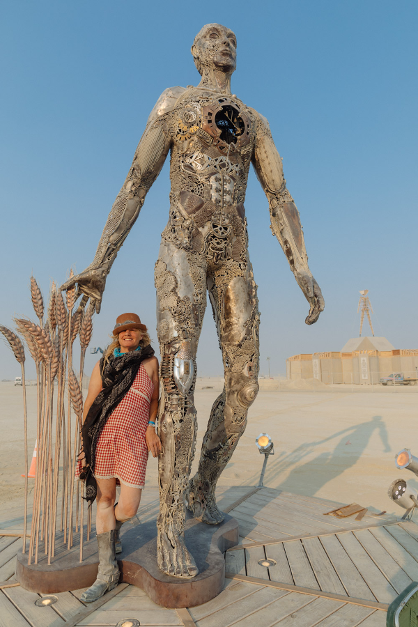 Artist Dana Albany with her “Passage” Sculpture, foreground, and The Man, background.